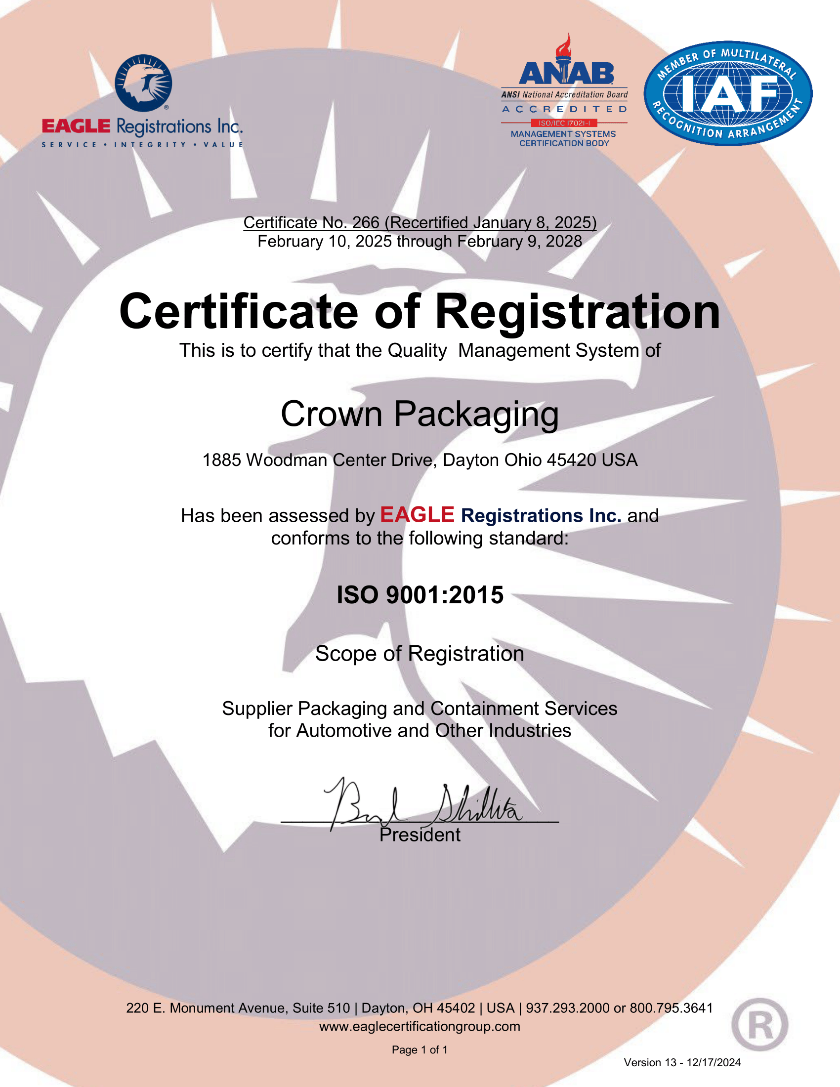 An independent body has reviewed Crown Packaging's processes and has designated Crown Packaging as ISO 9001:2015 Certified. This assurance means our processes meet a strict set of guidelines set by the ISO Committee on Conformity Assessment (CASCO).